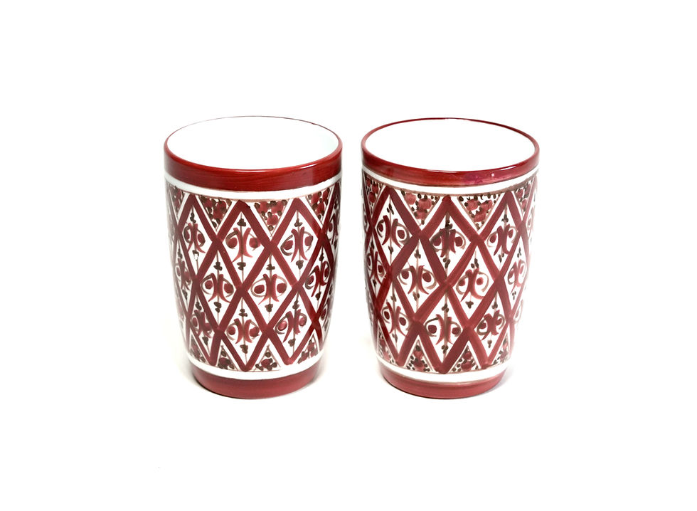 Lozenges is an intricate, detailed pattern in which geometric shapes harmonize. Depending on the size and the shape of the piece, the pattern gives an impression of a star, of a spiral, or of growing circles. The pattern comes in two colors - blue and red. This pattern is inspired by ancient traditional Christian pottery of the Mediterranean world.